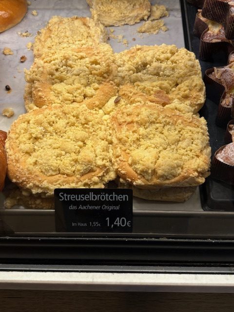 Your correspondent, in the Christmas market in Aachen, witnessed it brimming over with seasonal cheer. There are stacks of the city’s signature gingerbread, Aachener Printen, slices of fresh apfelstrudel and giant servings of quarkbällchen (normally, they’re walnut-sized and like a donut hole made with Germany’s signature cottage cheese-like product). The stall run by Nobis, the city’s most famous bakery, also has Aachen’s other original, streuselbrötchen. So does Moss, the rival baker. Anecdotal evidence suggests Aachen has two teams of believers: the Nobis streuselbrötchen-ites and the Moss streuselbrötchen-ites. Never has a roll made of yeast dough and topped with a streusel mix of butter, sugar and flour been such contested territory.