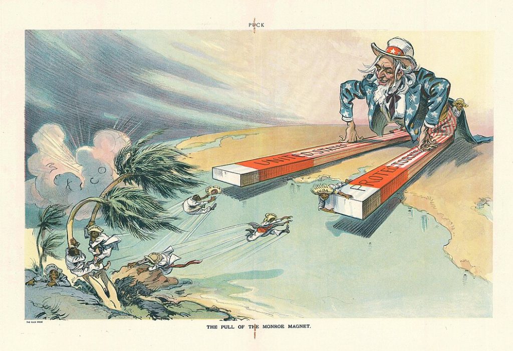 A 1913 cartoon in Puck magazine by Udo Keppler portrays the United States’ paternalistic behaviour towards South America. Uncle Sam’s legs serve as the poles of a magnet that pulls in others in the hemisphere because of the Monroe Doctrine. Look closely and the Hispanic men’s hats bear the name of each country. Public domain